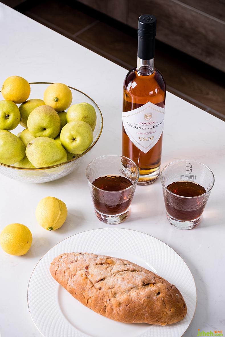 午后的陽光照射到中島臺上,享用一杯果酒、一份面包、水果,悠閑中令人放松身心。