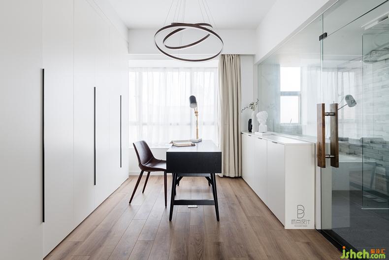 書房內(nèi)簡單的桌椅鋪陳開,白色收納柜上的裝飾花瓶和石膏像靈活運用,成為小小空間內(nèi)令人愉快的亮點。