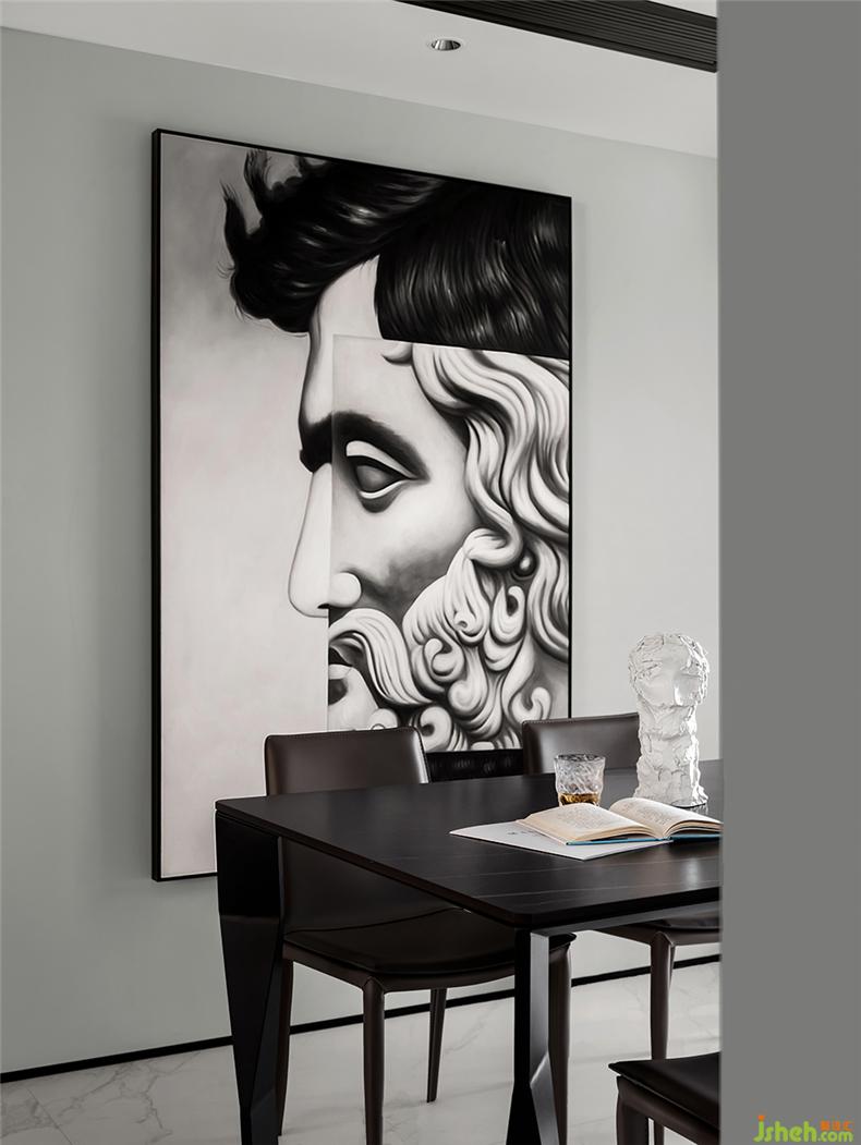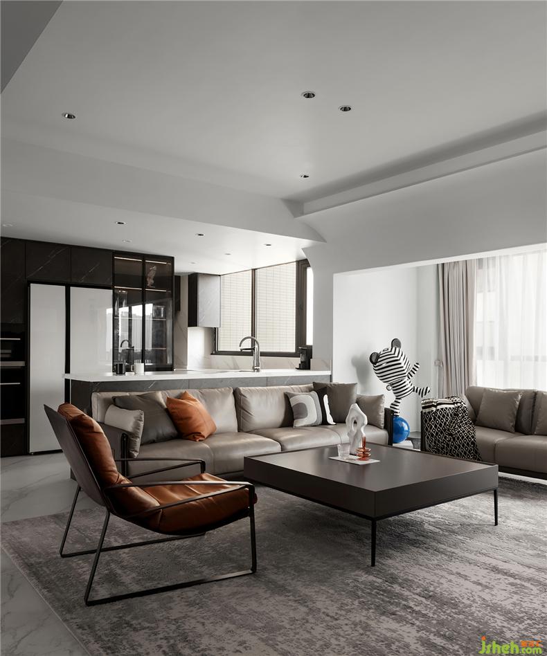 因為基于現(xiàn)代敞朗的格局形態(tài),軟裝的介入更偏向居者本身的性格和心理感受,整體簡約舒適,色彩也更顯俊酷,細(xì)節(jié)處則是側(cè)重時尚、個性,點綴的幾筆橙色,已足以溫暖