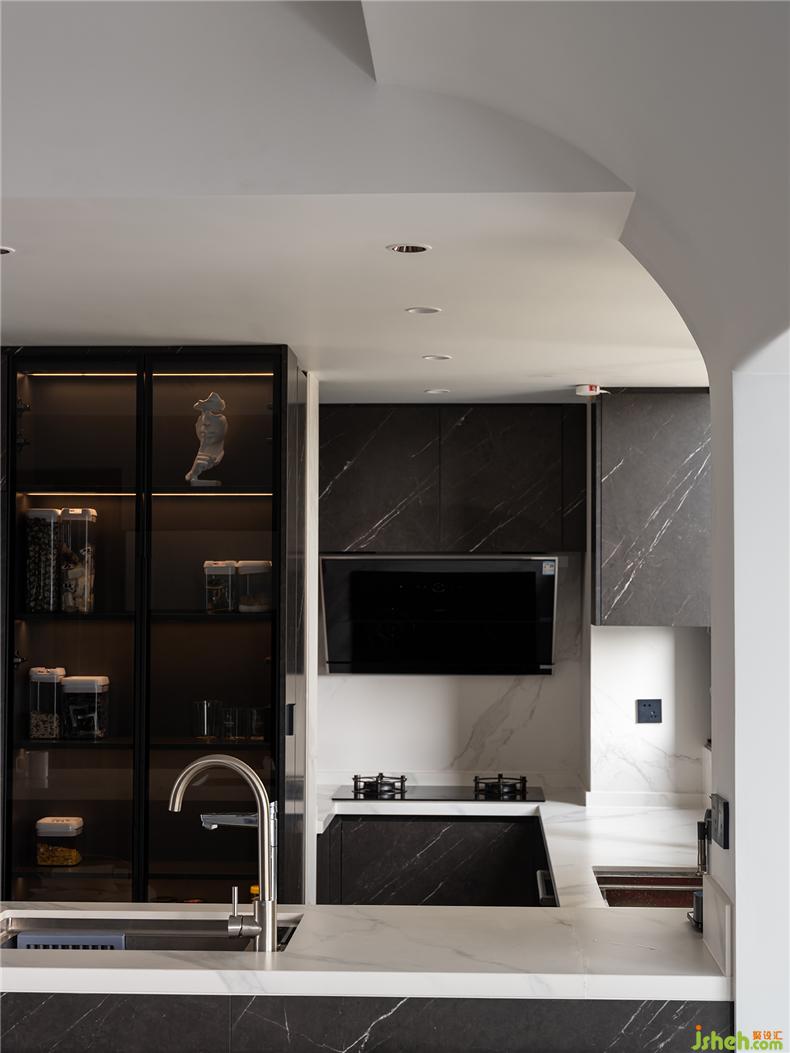 與客廳并列于縱線的島臺、開放式廚房,以大理石臺面預(yù)示功能區(qū)的轉(zhuǎn)換,突出的黑色玻璃柜體不僅實用,對應(yīng)著電視背景墻,為生活注入更多光景和滋味,自然地接納所有平淡或愜意的日子