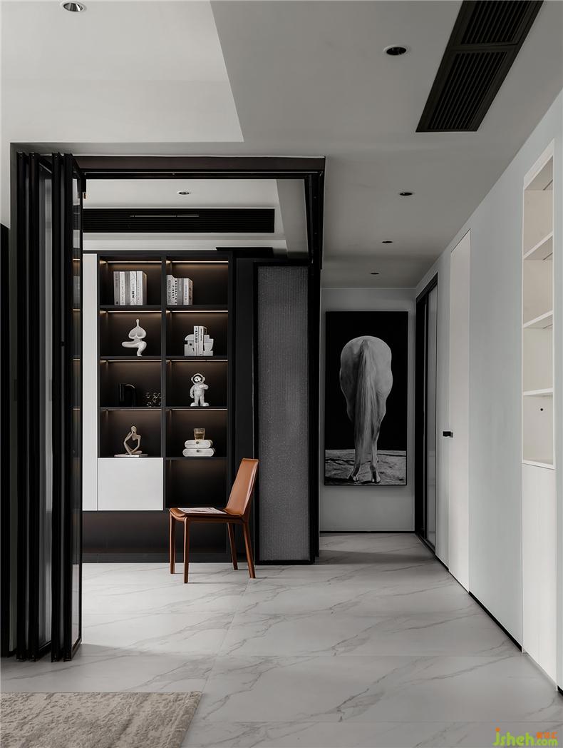 思想連續(xù)到書房,玻璃折疊門一方面引入自然光源,一方面擴(kuò)寬過道,必要時(shí)還可以關(guān)上,保證隱私且安靜自在