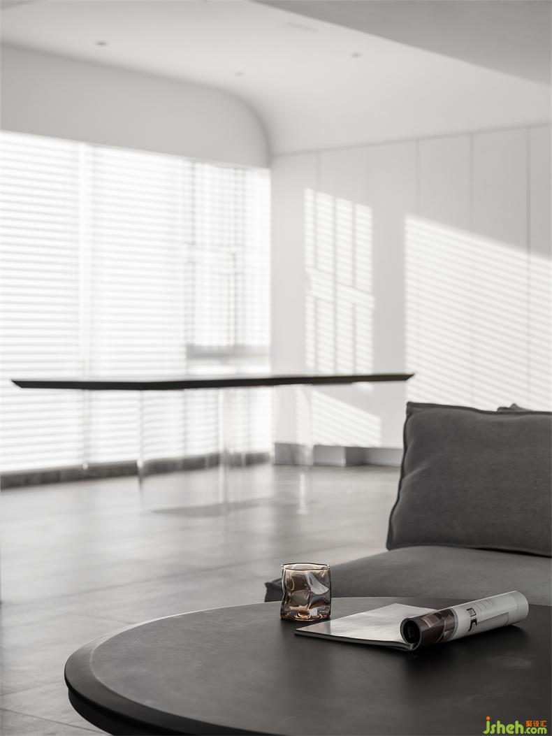 客廳、餐廳、廚房、書房,完全開放;三張簡單的桌子、一套舒適的沙發(fā)、室內(nèi)設(shè)計師幾筆弧線、一系灰色,奠定空間的純粹,無需彰示什么,生活就在那里,以腳步起點,光為色彩,隨心所動,繪出身體與精神上需要的所有。