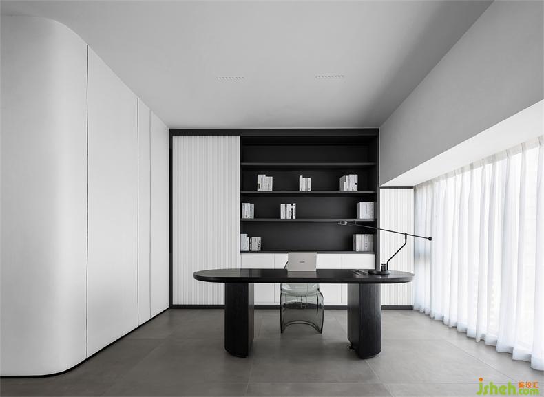 書房主調(diào)滲入了黑色,讓兩種極端的色彩糅合,標(biāo)識區(qū)域的特殊性,增加沉穩(wěn)的理智感,又簡練大氣,不會打擾思考,或者創(chuàng)作時的氛圍。