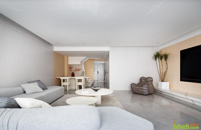 電視背景墻一整面的暗藏收納柜,大大滿足了收納需求。深圳家裝設(shè)計原木色的柜門與餐廳呼應(yīng),讓空間溫馨而舒適。