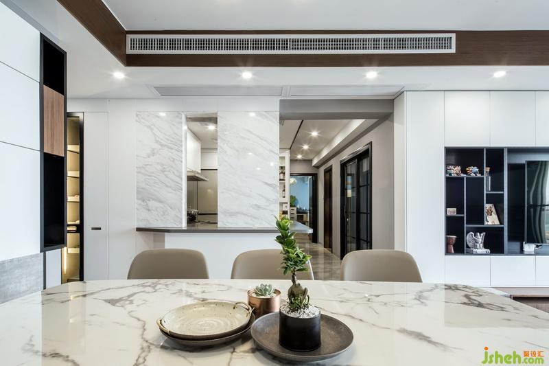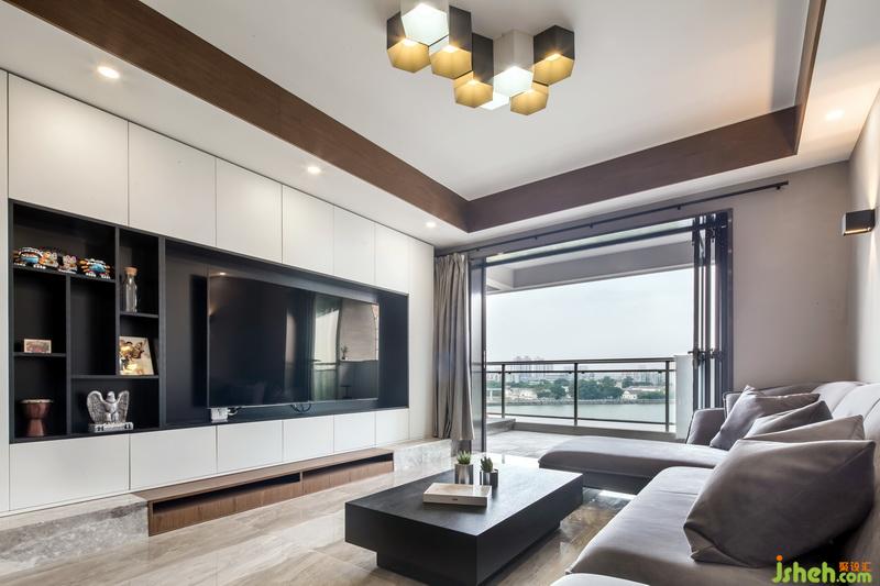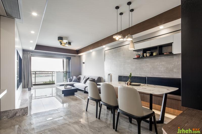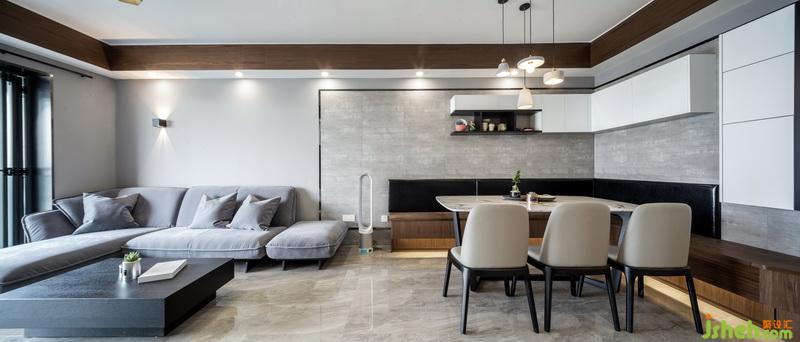 在空間立面設(shè)計(jì)上,造型做到一減再減的設(shè)計(jì)手法,讓空間變大,家具盡量使用實(shí)木家具以保證綠色環(huán)保,電視墻面是滿墻的柜體,卻并沒(méi)有造成視覺(jué)的擁堵,因?yàn)榕c櫥柜的臺(tái)面處理成同一面,巧妙的弱化了存在感,色彩上采用大面積色塊,灰色配合了高質(zhì)感的家具材質(zhì),燈光使用暖黃光,符合業(yè)主的品味也不失一家四口的和諧溫馨。