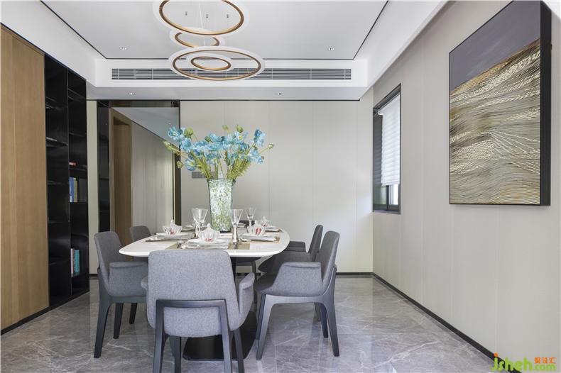 餐廳的設(shè)計(jì)剛好符合一個(gè)幸福的五口之家,別墅裝飾餐桌上淡藍(lán)色花束讓人用餐的同時(shí)能感受到自然地芬芳,開啟一天美好的生活。全屋智能化人性化燈光設(shè)計(jì),讓人隨時(shí)隨地都能體會(huì)到科技帶給生活的便利。