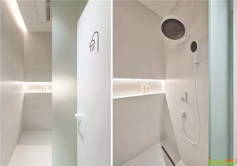公共衛(wèi)浴的區(qū)域,利用黑白兩色視覺(jué)上將空間一分為二,增大視覺(jué)寬度。SPA設(shè)計(jì)定制LOGO全身鏡方便顧客自拍的同時(shí)實(shí)現(xiàn)品牌傳播。所有潔具均采用德國(guó)高端品牌,在每個(gè)細(xì)節(jié)給顧客提供最好的體驗(yàn)。