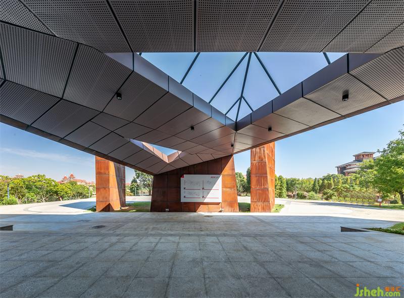 原有建筑的頂部涼亭,加以鋼構(gòu)玻璃做現(xiàn)代造型,配合燈光設(shè)計(jì),當(dāng)夜幕降臨,塔樓向天空投射具有力量的光束,就像是象征未來(lái)創(chuàng)新的希望焰火,直射天空,呈現(xiàn)一種“破土而出、豁然天成”的建筑藝術(shù)效果。