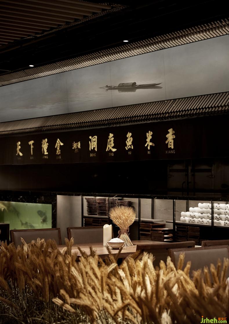 湖南作為中國最早的水稻種植區(qū)域,從“湖廣熟,天下足”到“湖南熟,天下足”的轉變,確立和鞏固了天下糧倉的地位。得天獨厚的自然條件造就了八百里洞庭的水草豐茂,被盛譽為“洞庭魚米鄉(xiāng)”。湘菜的背后,是數(shù)千年來豐富物產和深厚湘文化滋養(yǎng)的結果?!跋骓灐倍秩∽詺W陽詢的書法,意在對湖南作為天下糧倉、魚米之鄉(xiāng)的歌頌和贊美之情。餐廳設計
