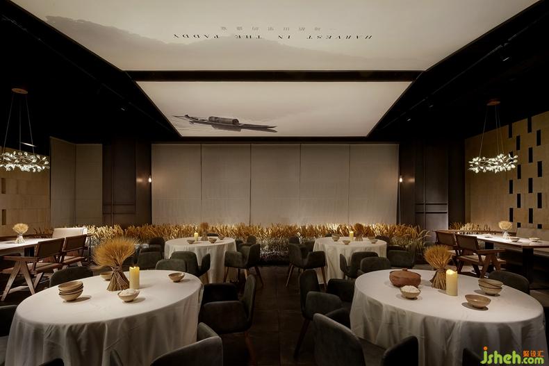餐廳內高仿真的稻田錯落分布,將餐桌環(huán)繞其中,樸實低調的灰磚地面襯以專業(yè)的燈光設計,舉目望去宛若置身秋日豐收現(xiàn)場,充滿自然美感。稻穗的形態(tài)、質感與肌理上最大程度尊重原型,以期構筑秋季豐收的金黃稻田,喚醒心中對本土生活的記憶和想象。