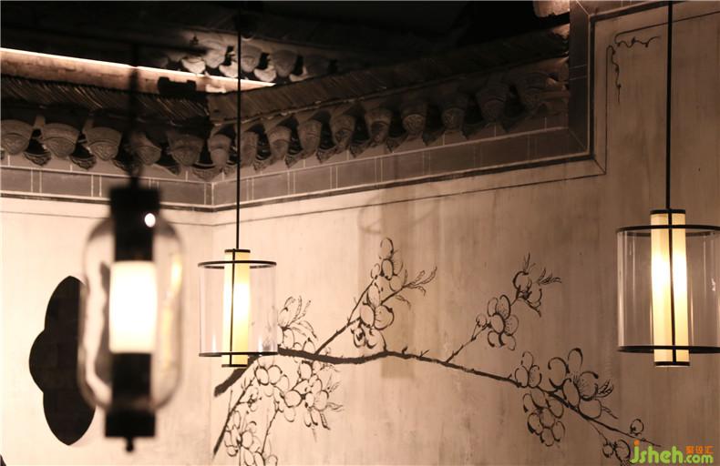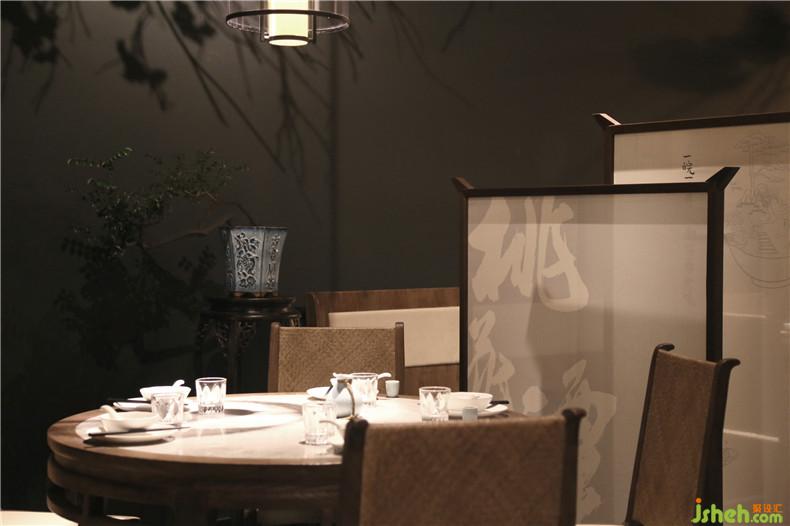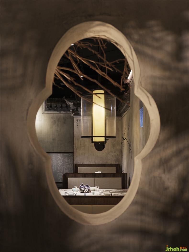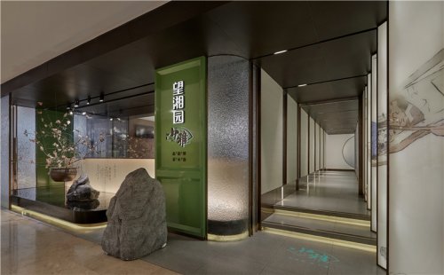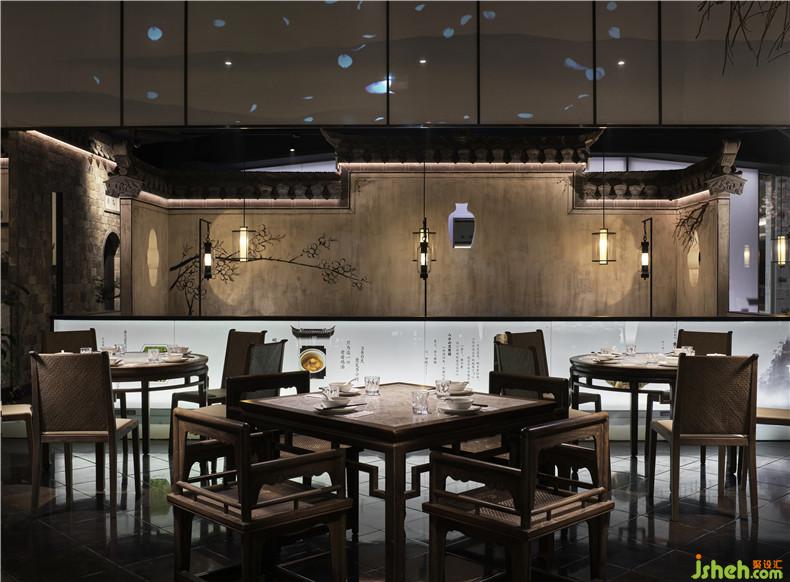 皖廚桃花潭外立面運(yùn)用整面玻璃燈光外墻,國畫寫意結(jié)合現(xiàn)代燈光設(shè)計(jì),繪制抽象徽派建筑線條。餐廳內(nèi)沿用徽派建筑馬頭墻墻體,并于高地懸掛紗幔以聲光電技術(shù)投影桃花瓣飄落場景,室內(nèi)多以中式園林框景手法結(jié)合燈光設(shè)計(jì)繪制陰翳感,金磚地面營造出水的倒影,拉伸空間的維度。深圳餐廳設(shè)計(jì)