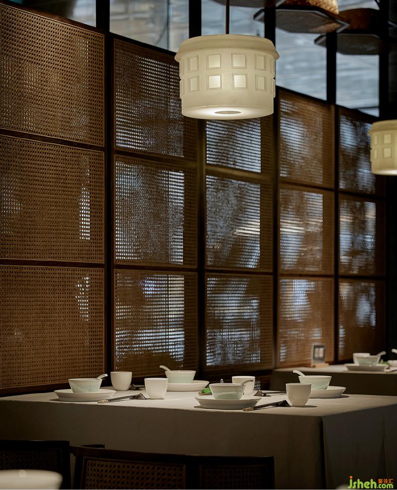 有山設計還創(chuàng)意性地將客家藤編工藝元素運用于餐廳隔斷,空間網(wǎng)格藤編屏風輕巧切割,室內(nèi)燈光通過屏風網(wǎng)眼流動,影影綽綽間,私欲交談聲,顧客走動的身影都能讓人感受到生活的氣息。從經(jīng)緯縫隙中透出點點光亮,渲染出溫馨的就餐氛圍和難得人情味。