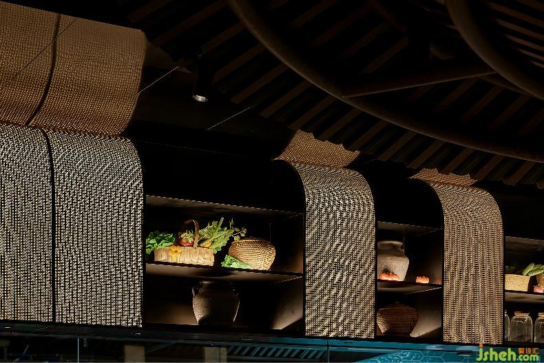 傳統(tǒng)手工藝制品是民間智慧和生活溫度的結(jié)晶。來自山中的藤類植物,經(jīng)由粗糙卻靈巧的雙手,成為隨處可見精美的盛具器皿。網(wǎng)格藤椅、卡座后方的藤編裝飾、明檔上方的藤編弧形隔板,傳統(tǒng)工藝品與現(xiàn)代設計材料結(jié)合混搭,得到重生。餐廳設計呼應“遷移”和“融合”的客家文化主題。
