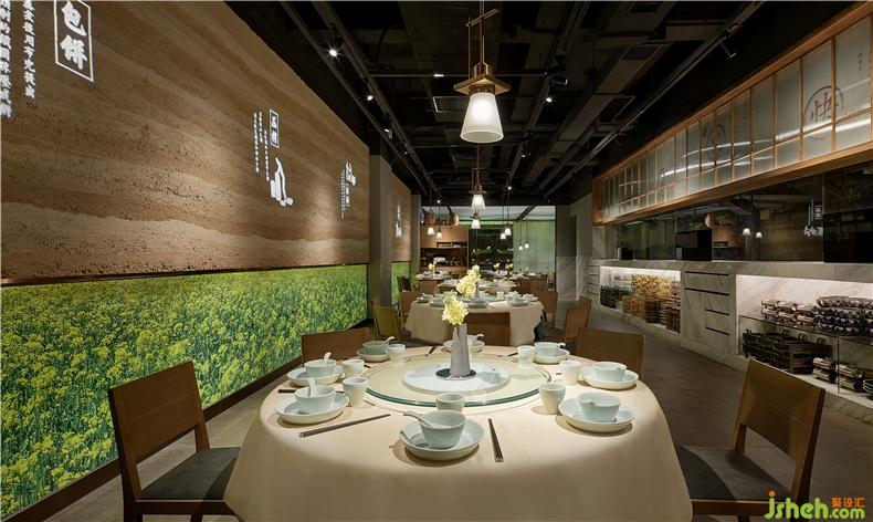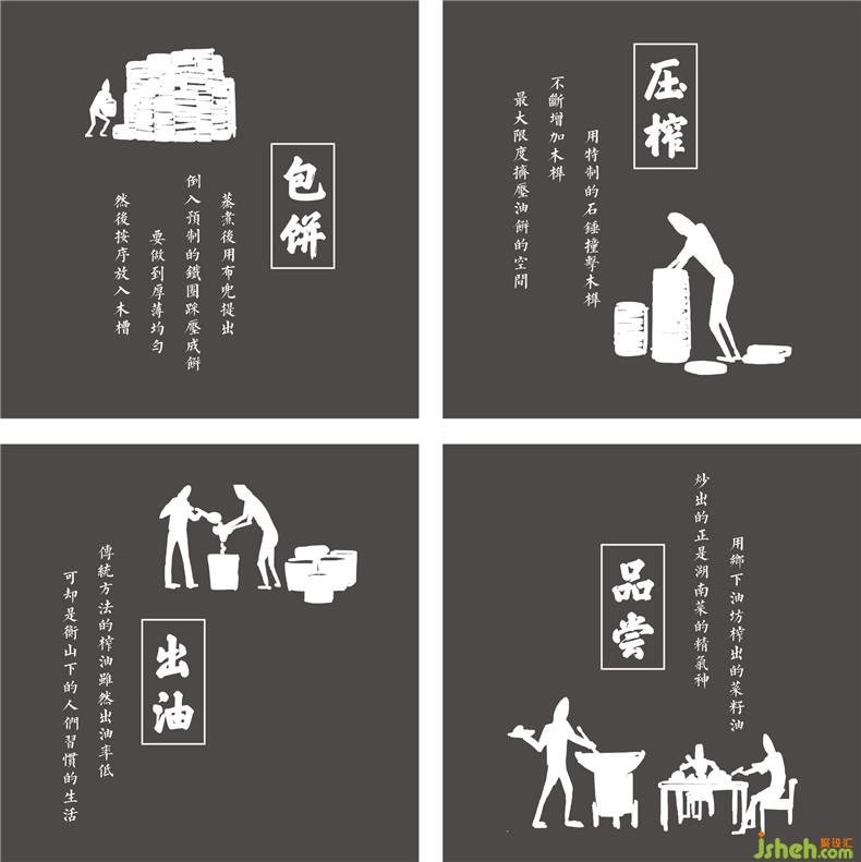 而為凸顯好油炒好菜,菜籽油的古法手工制作流程也被設(shè)計(jì)師用巖畫的手法加以呈現(xiàn),餐廳設(shè)計(jì)并通過投影形式映射在空間夯土墻上。夯土,這是油菜種植的土壤,是砌墻的土,亦是隱匿地道湖南味的沃土。