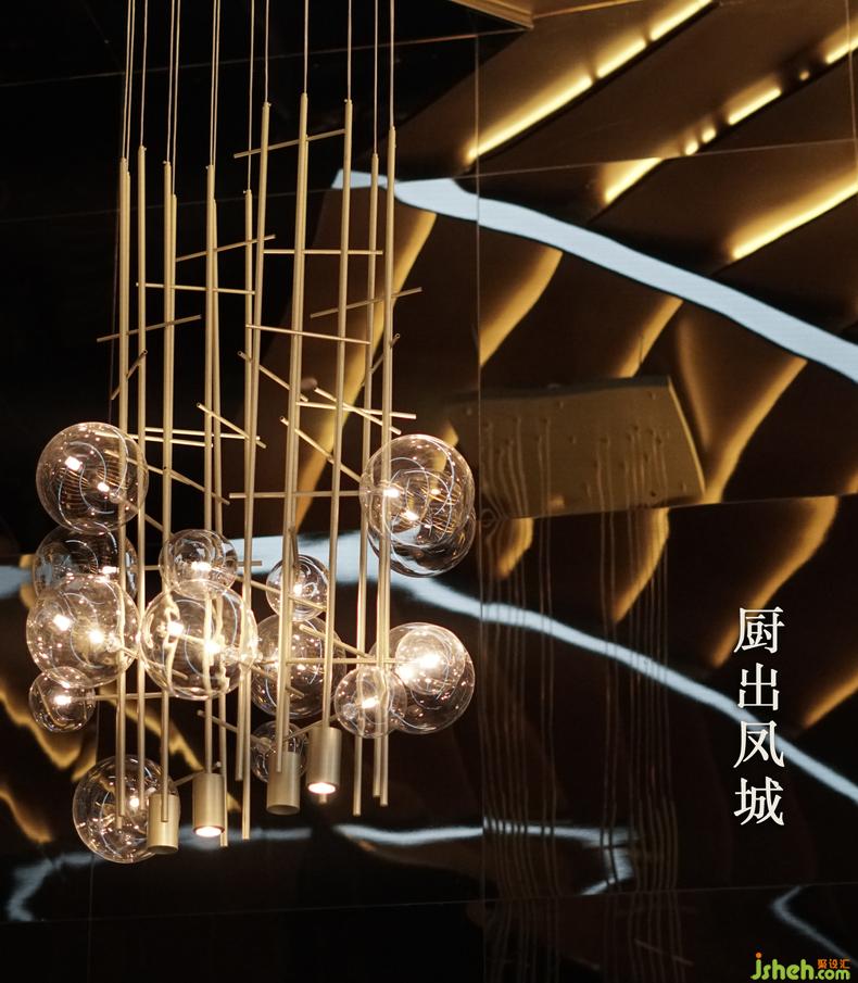 天花采用鏡面不銹鋼,反射出金色的廚房立面,也延續(xù)了廚師高帽裝置條形的燈光。
