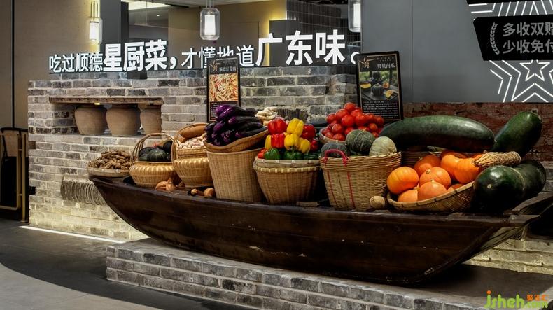 順德菜講究原汁原味,注重清美鮮甜,追求食材本味,食出真味是順德人的一貫追求。設(shè)計(jì)師特地從民間搜尋舊船,船上陳列著應(yīng)季的瓜果蔬菜。順德水鄉(xiāng)亦是魚米之鄉(xiāng),入口右側(cè)擺放著定制大木桶,餐廳設(shè)計(jì)里面飼養(yǎng)著鮮活的白鱔、小筍殼魚等順德特色魚產(chǎn);