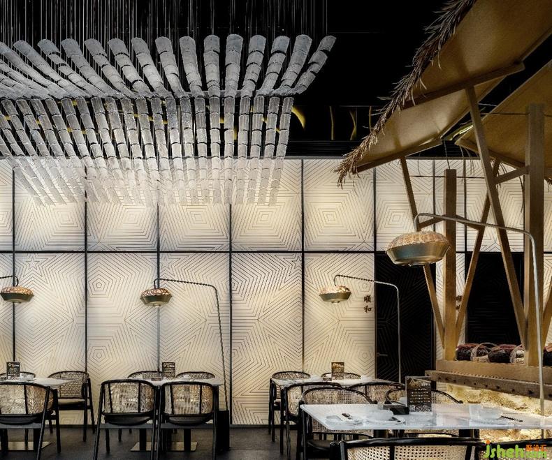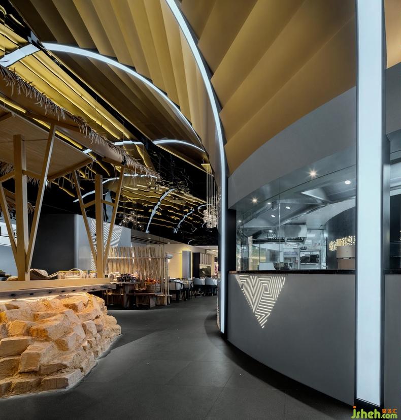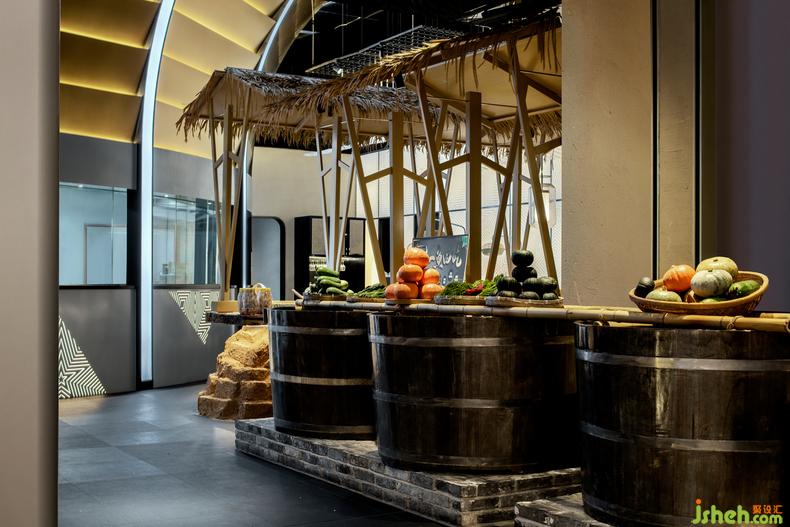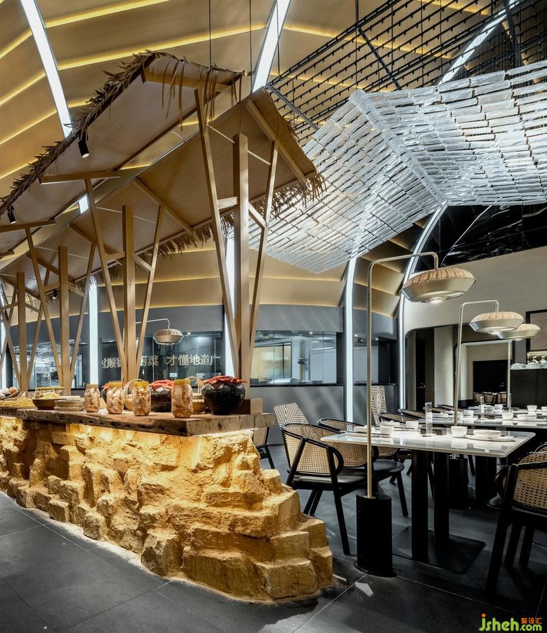 區(qū)域的隔斷采用夯土磚結(jié)合茅草屋的形式,餐廳設(shè)計(jì)既增加了空間就餐的隱私性,又能作為食材的展示臺(tái),上面陳列著順德家家必備的佐料食材,如嫩子姜、臘肉等等。