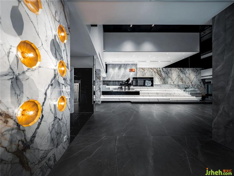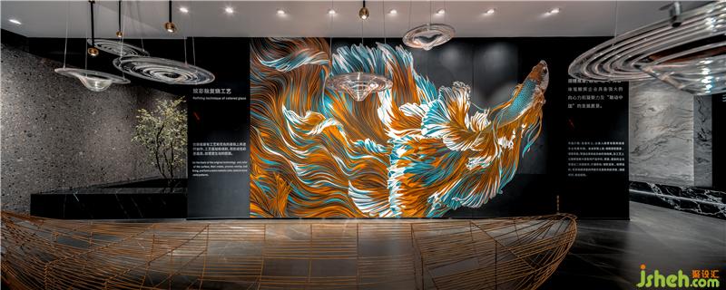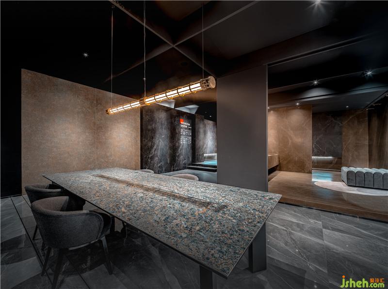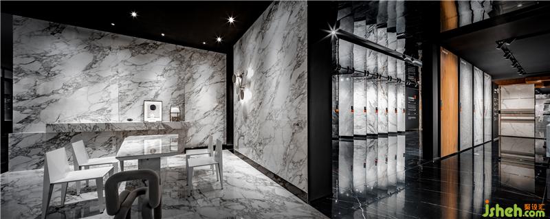 《桃花源記》有云,“初極狹,才通人。復(fù)行數(shù)十步,豁然開朗?!表樰x巖板展廳入口平緩,進(jìn)入大堂,有豁然開朗之感。層高7 米,天花飾以黑色不銹鋼鏡面,延拓空間,弱化其他材質(zhì)的存在感。譬若國(guó)畫所講求的計(jì)白當(dāng)黑——一紙筆落,留白三分,韻味悠長(zhǎng),以內(nèi)斂空間凸顯展陳效果展廳裝修設(shè)計(jì)。