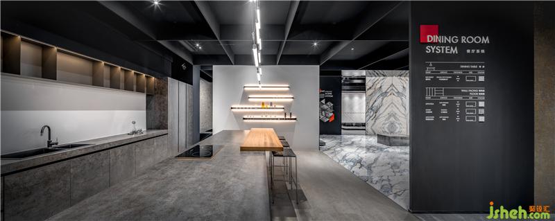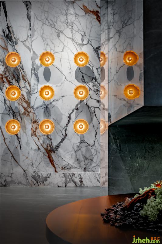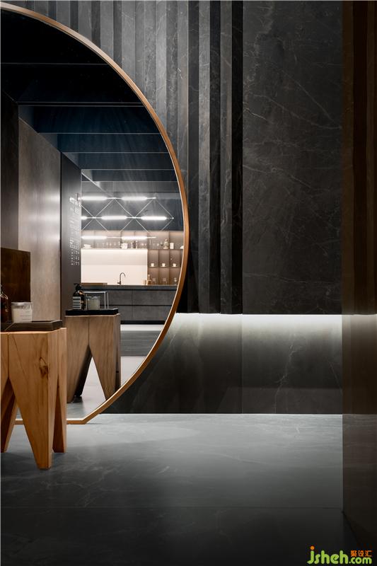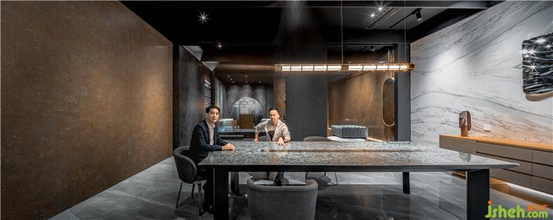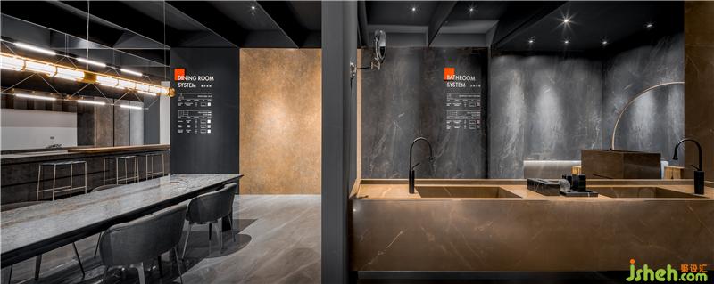 以電影中的長鏡頭手法解構(gòu)空間,形塑明晰動(dòng)線——不折返,一“鏡”到底。墻及地面運(yùn)用不同巖板,區(qū)隔出客廳、餐廳、廚房、衛(wèi)浴、選材區(qū)、洽談區(qū)的不同場域??蛷d的對紋電動(dòng)門、客餐區(qū)的小園景、餐衛(wèi)的色調(diào)銜接……力求介入設(shè)計(jì),將場景轉(zhuǎn)換消弭于無形,讓觀者沉浸式地體驗(yàn)其中。