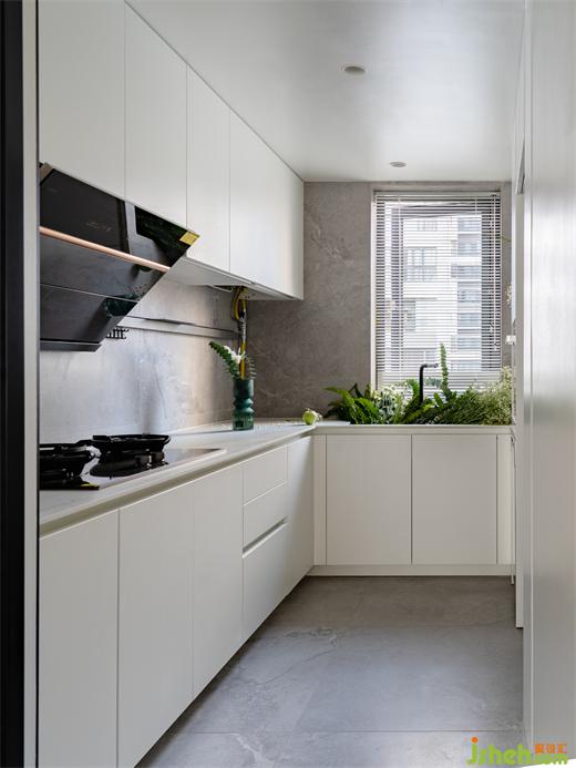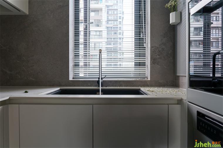 廚房墻地磚使用同款灰色瓷磚,巖板臺(tái)面沒加厚,海境界家裝設(shè)計(jì)而且沒有用擋水邊,視覺效果更簡潔干凈。