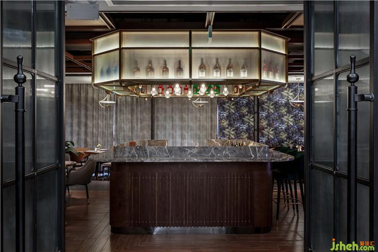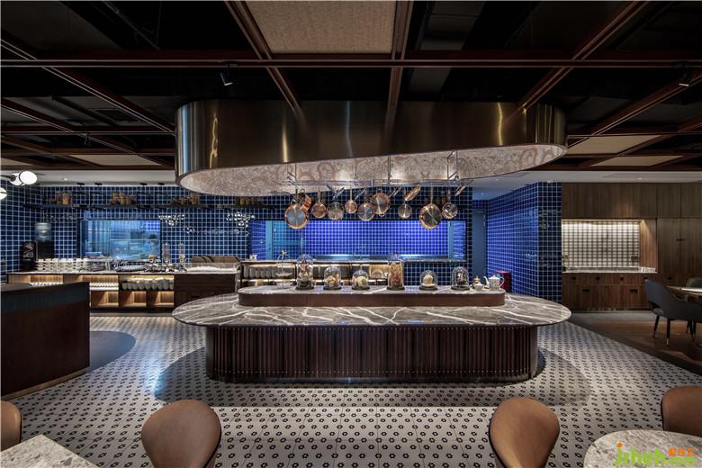 空間整體使用自然的材料搭配機理藝術(shù)漆,包括桌子和酒吧吧臺造型使用的胡桃實木木、皮革座椅、定制鐵藝屏風上的拋光銅制品以及波浪紋工藝玻璃、廚房區(qū)域的藏藍色方格瓷磚和啞面水磨石地板。藍色調(diào)復古花藝墻布裝飾著餐廳內(nèi)特定的幾面墻壁。帶有不同區(qū)域分布的編藤天花造型擴展了餐廳的視野。保留原有外窗,周邊布置就餐位置,最大化餐廳內(nèi)部光線的投入以及用餐人員的景觀視野。