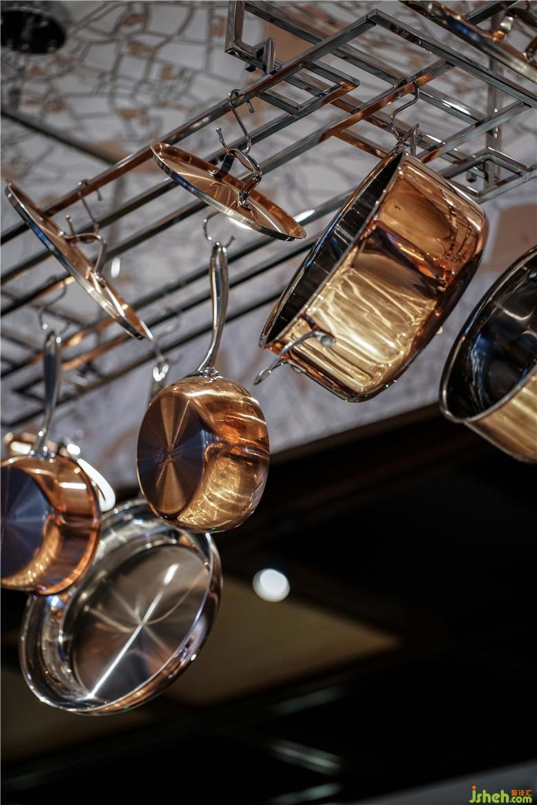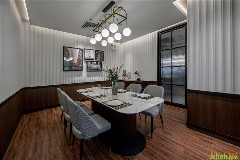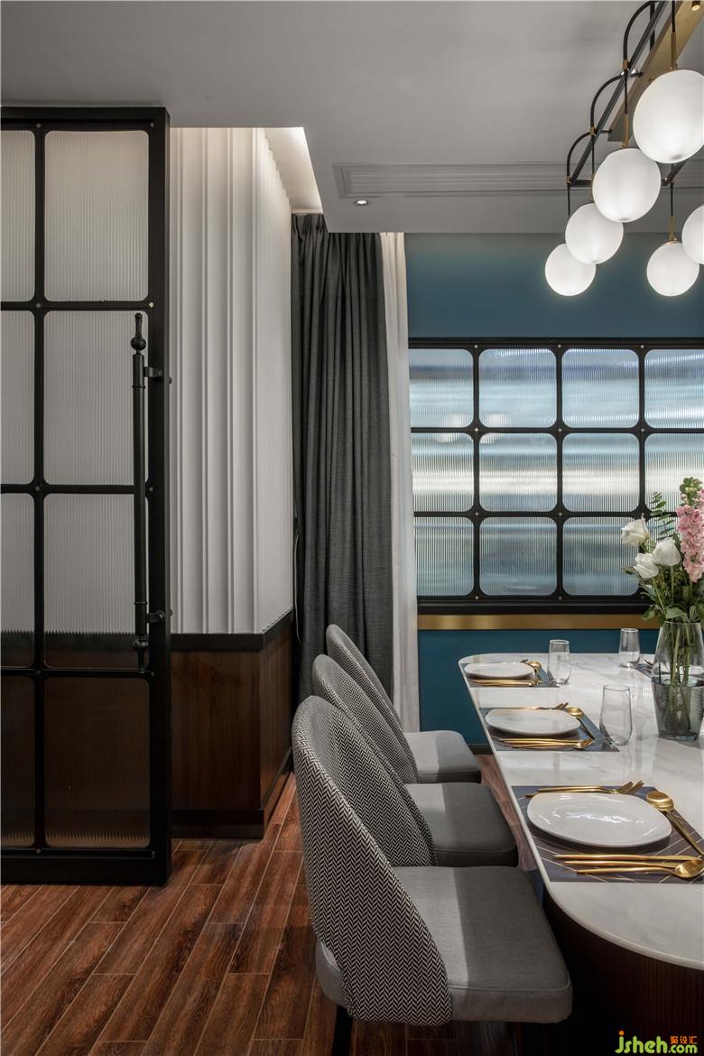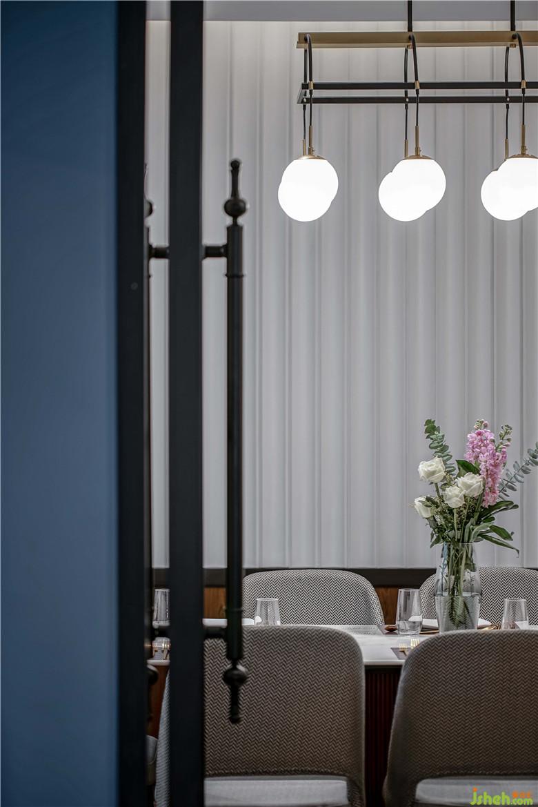 黑色鐵藝屏風(fēng)造型更近一步的強(qiáng)調(diào)了復(fù)古情調(diào)的延展性。制造門洞的構(gòu)式作為兩個(gè)用餐區(qū)域的劃分布置。內(nèi)部里,整體上使用藍(lán)色花藝墻布來呼應(yīng)設(shè)計(jì)師對(duì)重回歷史這個(gè)主題所切入的歷史感。同時(shí),深色系胡桃木墻裙跟絨布窗簾也給予了客戶一種溫暖的用餐經(jīng)驗(yàn)。希望將通過這個(gè)劃分幫助空間制造更多的層次。形成一個(gè)更有特色的景觀就餐區(qū)域。餐廳設(shè)計(jì)