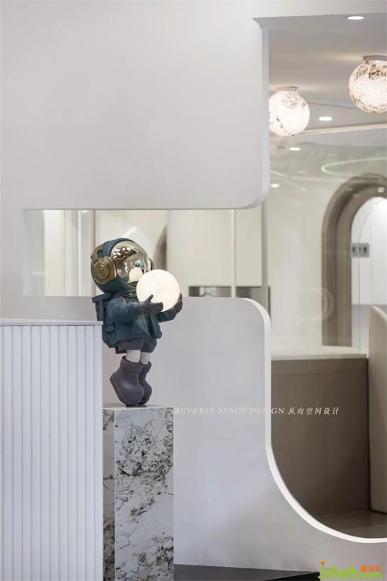 藍色星球,金色星球,白色球燈,高低錯落擺放,宇航員陳設擺件,火箭元素設計,前廳穿插連接一樓的多功能游玩區(qū),托育中心設計讓整個空間充滿童趣和探索的興趣。