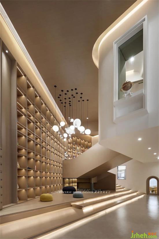 Blue planet, golden planet, white ball lamp, high and low scattered display, astronaut furnishings, rocket pictographic design, the front hall interspersing with multi-functional play area connected to the first floor, so that the whole space is full of children's fun and exploration interest.