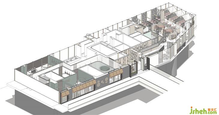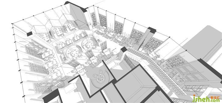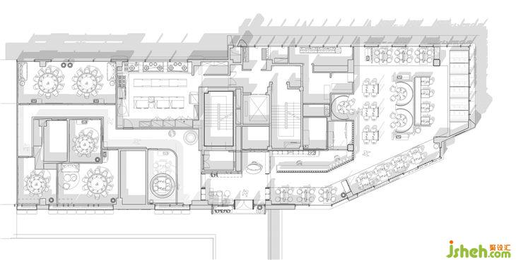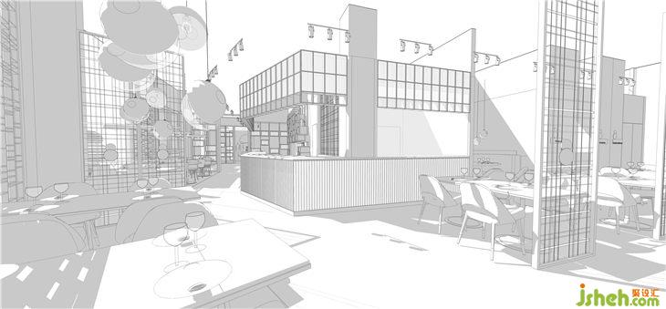 原圖建筑中間的核心筒處在整個(gè)餐廳最核心的中間位置。很尷尬的把空間均分為二。布局上利用廚房和吧臺(tái)吧畸形的角落空間利用起來?;銥檎R园膳_(tái)為紐帶,把廚房和就餐區(qū)的功能分開,把服務(wù)聯(lián)系在一起。