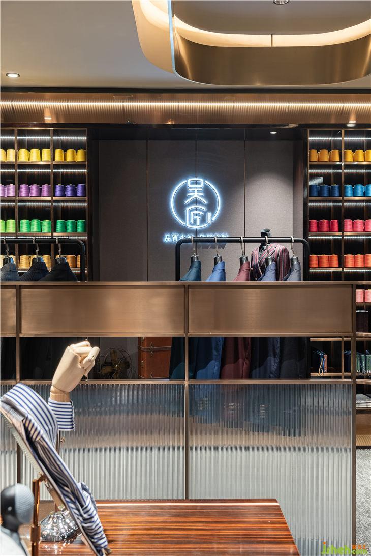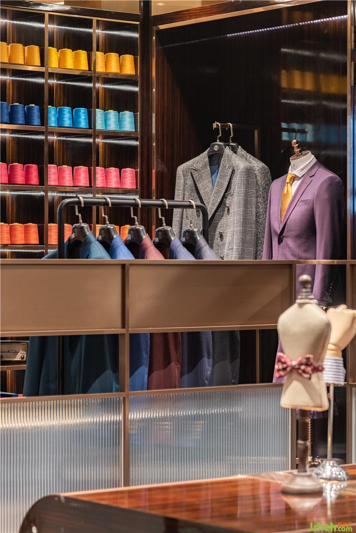 本身空間不大布局上采用多種功能融合的方式布置,核心區(qū)為西裝展示及客人量體裁衣區(qū)域,空間里沒有設置獨立的收銀臺,把酒吧臺融合到西裝定制的空間,把店鋪的售賣感降低,定制西裝的同時,也是洽聊品酒的地方。店鋪燈光的主光源采用間接照明的方式為主,功能性點光源為輔,不同區(qū)域選用不同的燈光效果,有力的提升了店鋪的空間視覺效果!