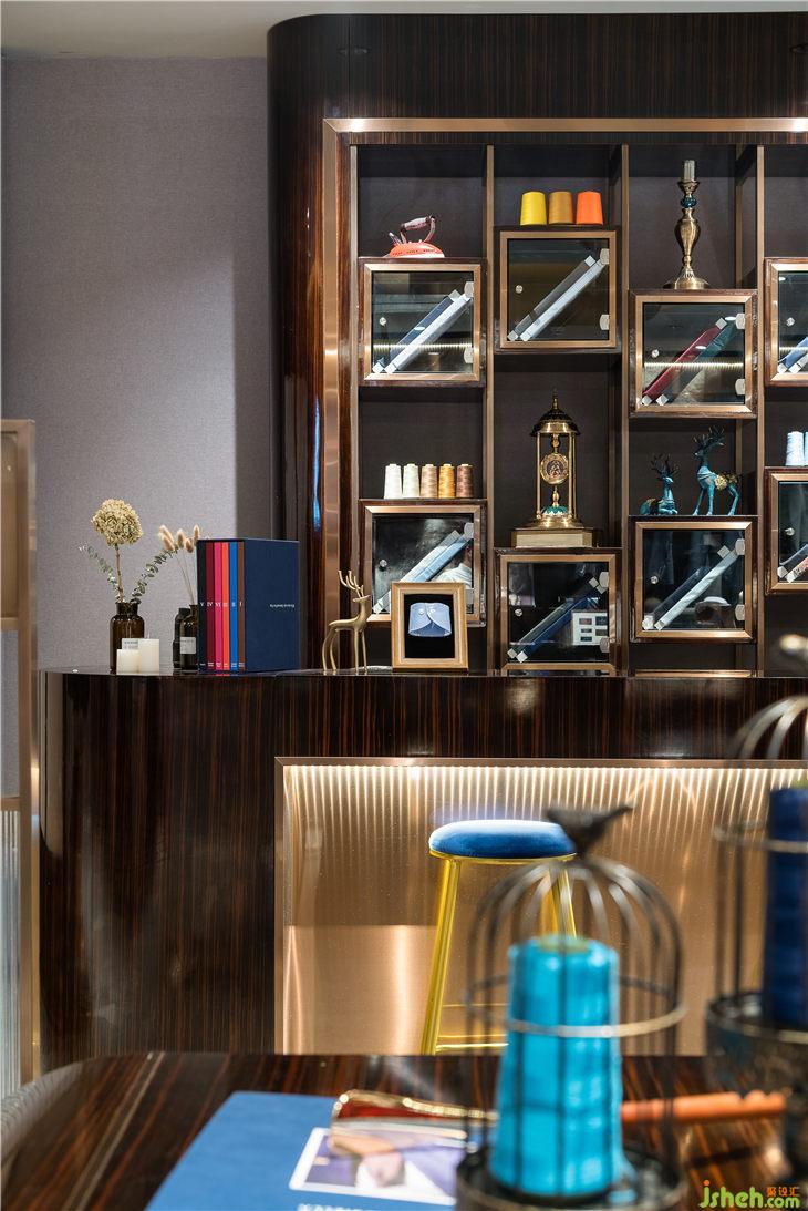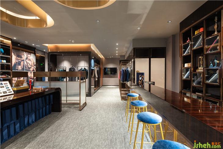 西裝店鋪內部展柜同樣以深色為主色調,內鑲式的展柜,使得空間感更加的整潔。金色的茶幾和時尚的深色沙發(fā),為單點的空間增添了幾分時尚感,在空間中適當的選用了金色作為裝飾,體現西裝定制的精致感。