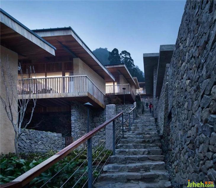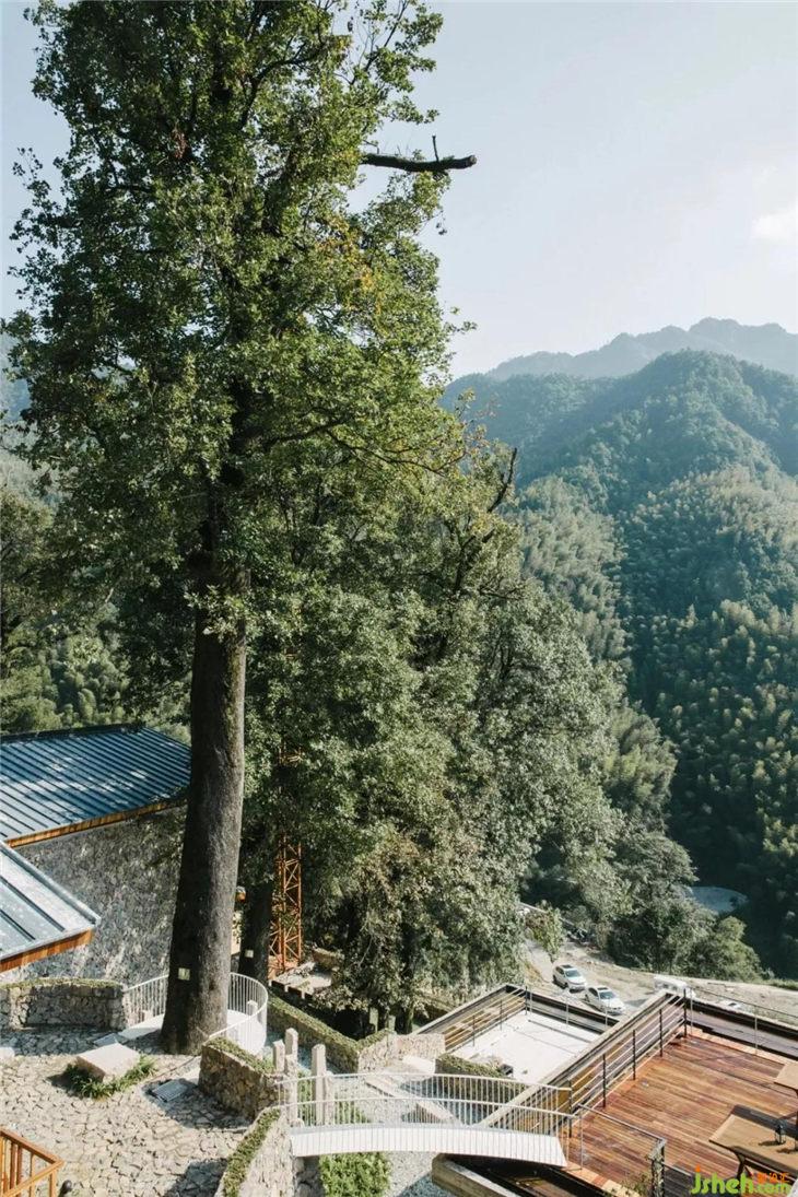 他們包下整個村子,讓整個民宿能夠完美地與自然融為一體,建筑依著山勢一層層錯落分布,松陽傳統(tǒng)建筑的夯土墻、壘石、小青瓦亦被運用得恰到好處,村子里珍稀的百年古樹群也被納入建筑布局,房屋圍繞著古樹展開,仿佛將古樹攬入懷中,這也是“原舍·攬樹”名字的來源。如果從遠處看,民宿像是被山川懷抱的理想村落,隱于山中。