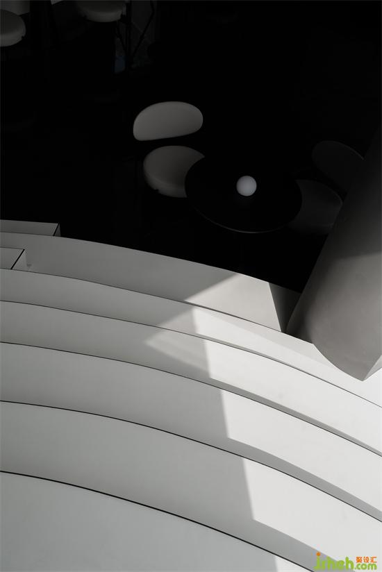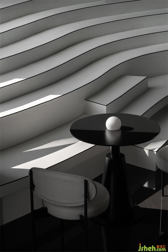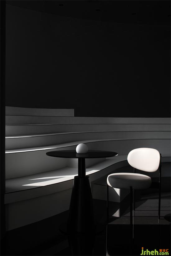 作為秀場的主題色,黑與白是永咖啡&酒吧復(fù)合空間設(shè)計不過時的經(jīng)典,結(jié)合當(dāng)代藝術(shù)思維進行空間的重塑。深與淺的色塊將冰山與水面區(qū)分,淺色的休息區(qū)是冰山的層層遞進,深色鏡面組成的地面成為深不可測的湖泊,形成了視覺上的空間對話。