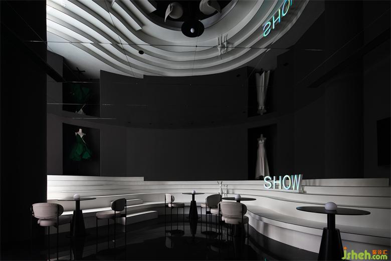 The fashionable show doesn't need much decoration. The white steps were given a natural curved arch shape, with clean lines outlining the cut shape of the iceberg, winding forward. The black lines traced the boundary of the steps and became a sign to draw the eye.
