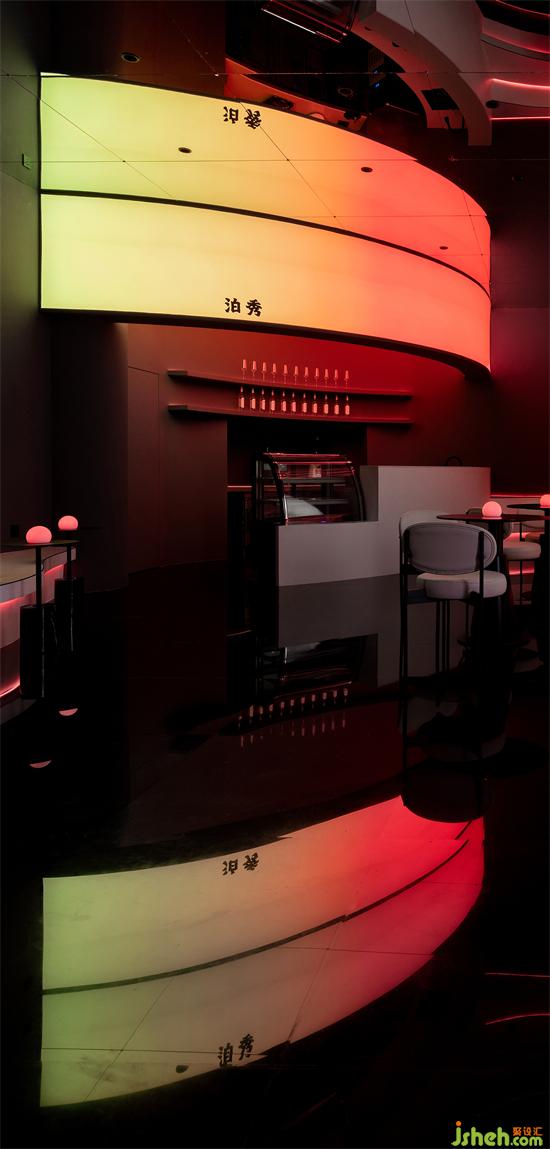 在空間中,通過依附在臺階上的燈帶,實(shí)現(xiàn)冰川與極光的完美融合。而自然極光變換的各種色彩,紅色,藍(lán)色,紫色,綠色..……讓空間充滿了溫度的變化。