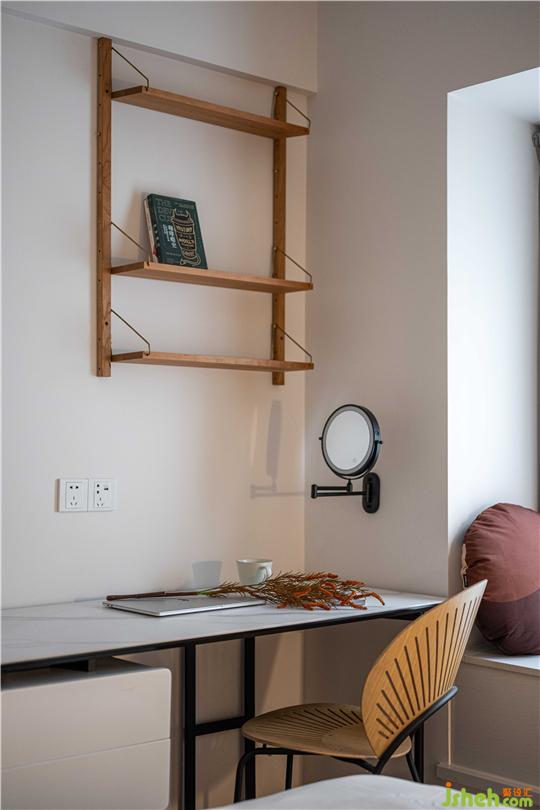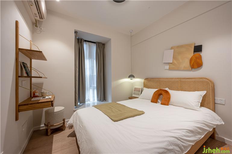 全屋都用了奶咖色的墻漆,通過(guò)暖光的營(yíng)造,整體出來(lái)更溫馨;墻身拱形并非為了做而做,實(shí)際原來(lái)是右側(cè)有一個(gè)凸出來(lái)的柱位,為了將柱隱藏又不影響緊湊的客廳空間面積,廣州舊改設(shè)計(jì)將柱子做成了拱形的對(duì)稱關(guān)系,包括把拱形和各種幾何的元素沿用到各個(gè)空間的軟裝上;客廳陽(yáng)臺(tái)之間使用了折疊落地窗的方法,平常打開(kāi)也可以是客廳的一部分,想晾曬的時(shí)候關(guān)上折疊窗,又可以成為臨時(shí)的生活陽(yáng)臺(tái)。