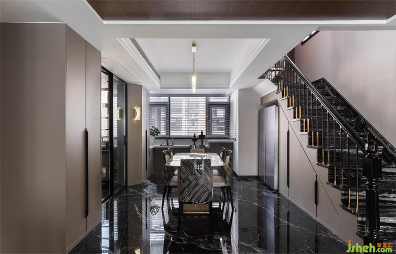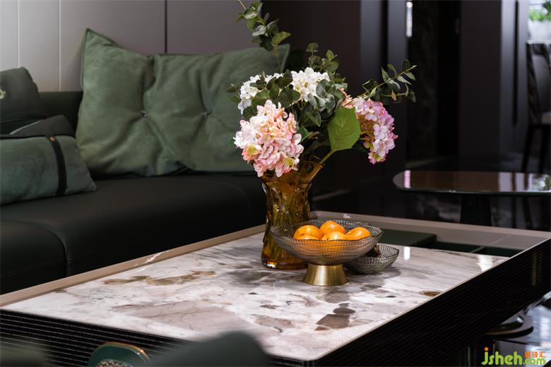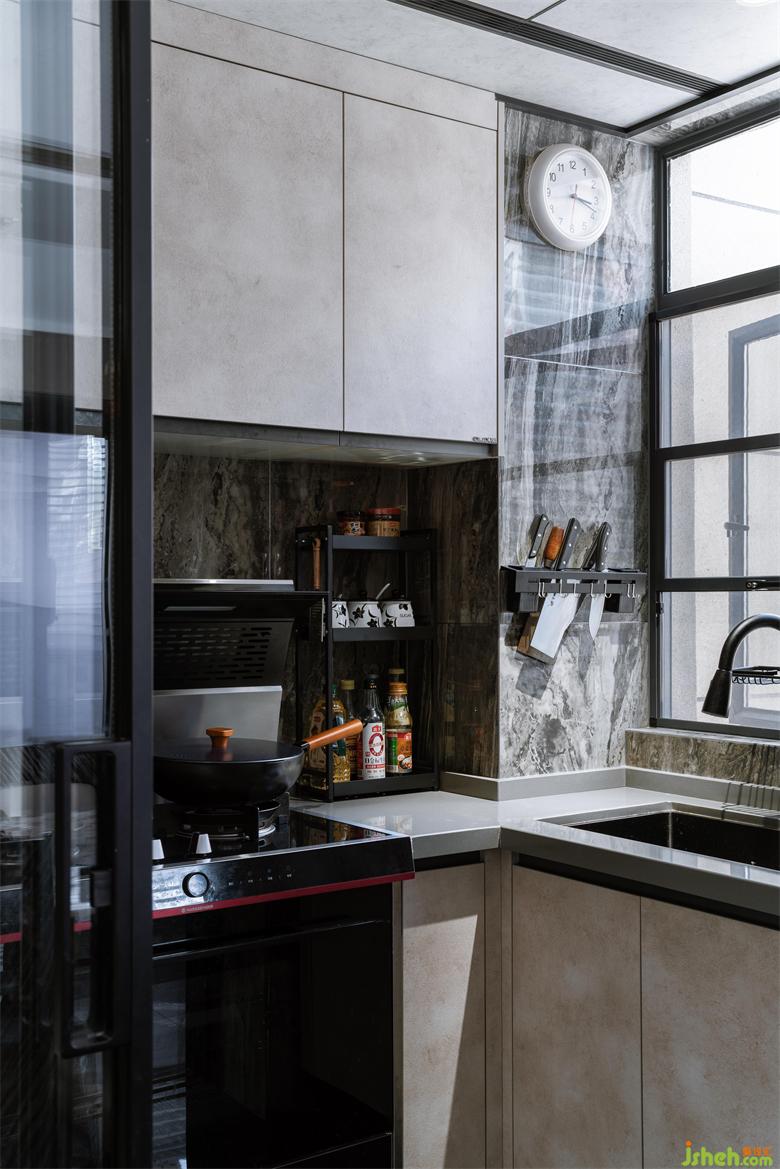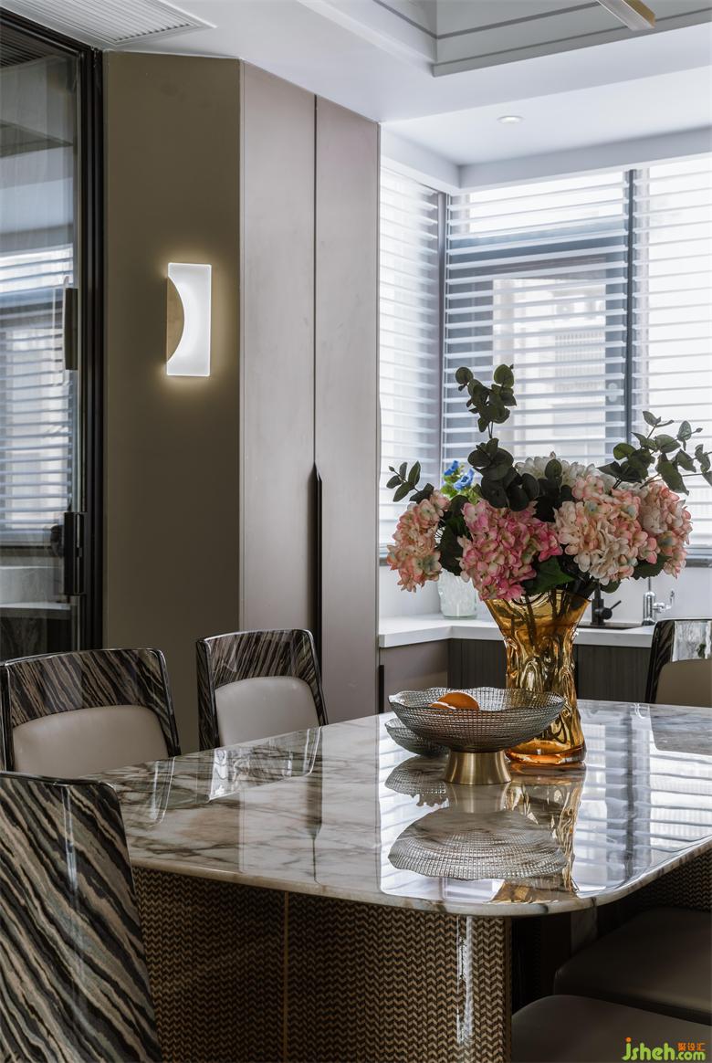 利用酒柜厚度彌補(bǔ)了餐廳與客廳抽線不水平,空間不方正的問題。斜角的設(shè)計(jì)讓空間變得活潑,有處理?;▓@家居設(shè)計(jì)增加的操作臺面大大提升了烹飪的時效。