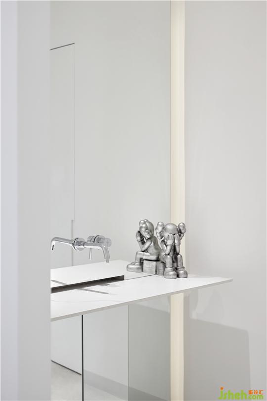 二、 小書吧/小憩區(qū)。墻面白色的懸浮書架上,羅列著近些年設(shè)計師自己閱讀過并覺得值得購買的書籍,還有很多書籍在不斷的補充進來。書架對面的弧形白色沙發(fā)即是坐定并閱讀的區(qū)域。為了使閱讀者的注意力更加集中,我們?nèi)趸诵〔鑾椎拇嬖?,用透明的材質(zhì)實現(xiàn)了它只放一杯咖啡或茶、不令閱讀者分心的功能。坐在沙發(fā)上向左看,可以看到對面樓上的空中花園,真是自帶好景、可以讓人浮想聯(lián)翩的小角落。