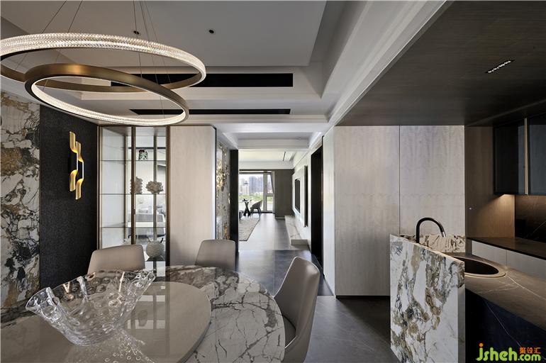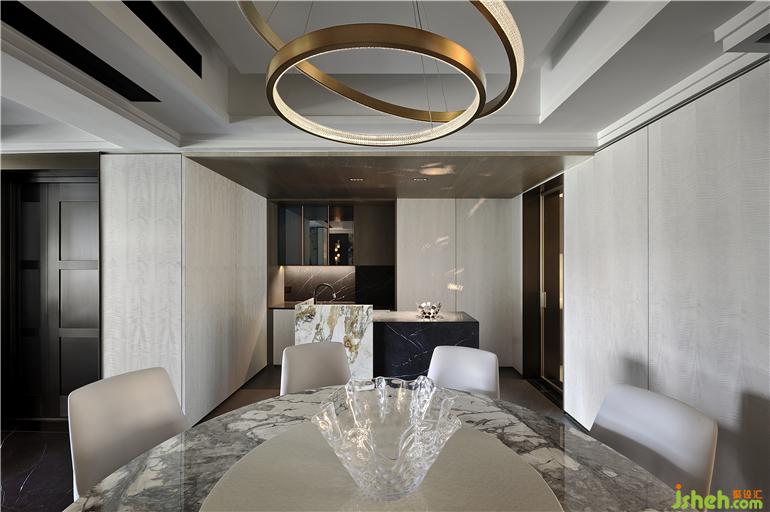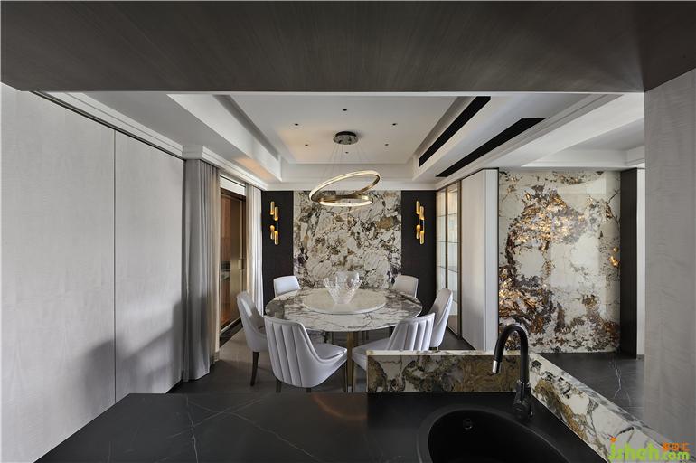 公共區(qū)域以玄關(guān)為界,隔而不斷,避免空間因?qū)掗煶叨葘?dǎo)致空泛。一塊形似“魚躍龍門”的大理石裝飾其上,以美好的寓意提升空間的人文內(nèi)涵,并奠定了空間輕奢的基調(diào)。