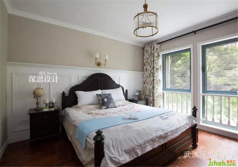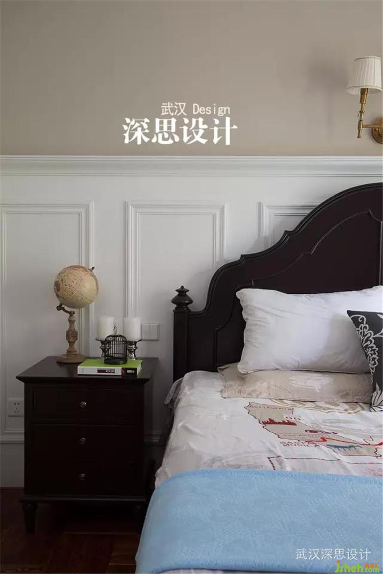 主臥,一張深色的古典美式風(fēng)格雙人床,白色的美式木質(zhì)墻裙,深淺的配色,明快簡潔又不失沉穩(wěn)大氣,精美的銅燈,呼應(yīng)了空間的品質(zhì)感。