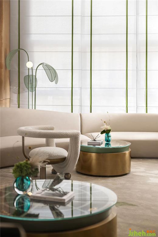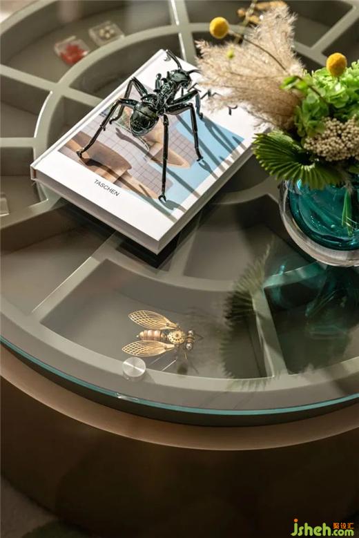 野竹分青靄,樹深時見鹿?;⌒紊嘲l(fā),封藏著各種蟲蝶的茶幾,闡發(fā)著生活的盎然樂趣。城市展廳設計以鹿的藝術裝置映襯,留駐在這城市綠洲,猶如漫步在林間樹下。為空間增添一抹輕快靈動,帶走了城市的陰霾。