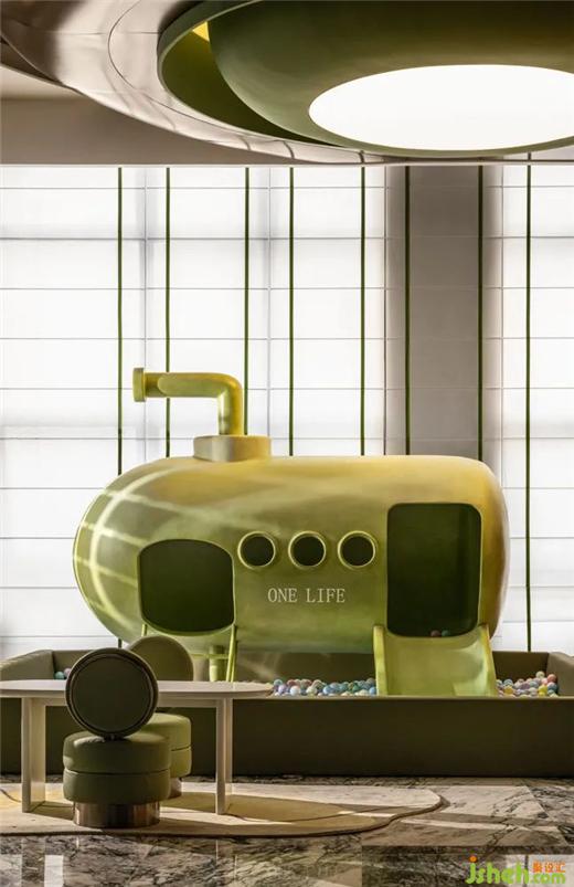 在這里,容納各種天馬行空的奇思妙想;在這里,找回純粹單純的童真之心。以?xún)和囊暯浅霭l(fā),采用清新、溫馨的色調(diào),城市展廳設(shè)計(jì)打造出溫柔、童真、舒適的氛圍基調(diào)。造型別致的座椅和藝術(shù)裝置,早已準(zhǔn)備好的游樂(lè)設(shè)施和玩具,大孩子和小孩子們可以在此盡情玩樂(lè)。