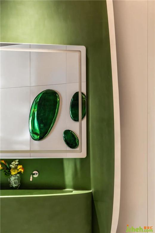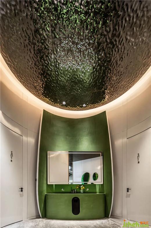 逐光生色,光之秘境。衛(wèi)生間也是展示中心的重頭戲,MAYA LIN藝術(shù)家創(chuàng)作而成的藝術(shù)裝置,如珠寶般的雕塑,又宛若水滴。城市展廳設(shè)計(jì)由單獨(dú)拋光的金屬片組成,可光線的明暗而變化,隨著光線移動(dòng)而閃爍,形成微妙的色彩漸變。