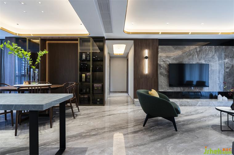 流暢的設(shè)計(jì)線條沒有冗余的裝飾,多人位皮革沙發(fā)質(zhì)感舒適,灰色巖板電視背景墻搭配黑色不銹鋼低調(diào)內(nèi)斂,頗具質(zhì)感,秩序井然間,再加入墨綠的休閑椅稍作點(diǎn)綴,金山湖中心裝修設(shè)計(jì)為空間注入一絲活力與生機(jī)。