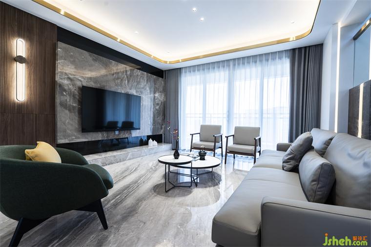 The smooth design lines have no redundant decoration, the multi-seat Leather Sofa feels comfortable, the gray slate TV background wall matches the black stainless steel low-key introverted, quite has the sense of texture, the order is orderly, then adds the dark green leisure chair slightly to embellish, breathe a little life into the space.