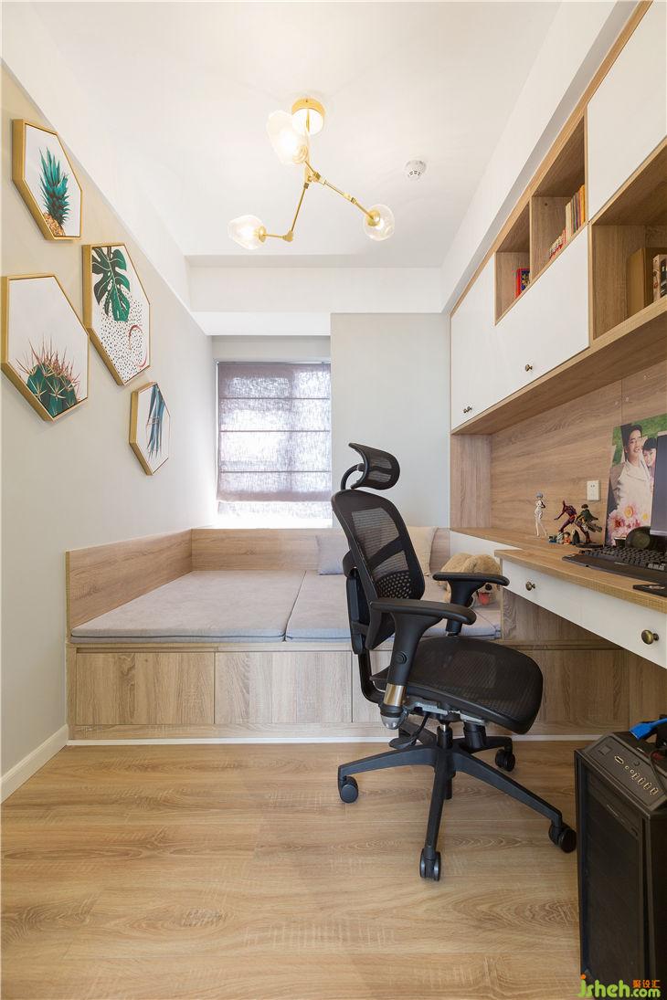2、書房設(shè)計成靈活變動空間,設(shè)計兩扇外掛谷倉門,使客餐廳與書房連成一塊,空間更加寬闊,采光也得到最大的補充。