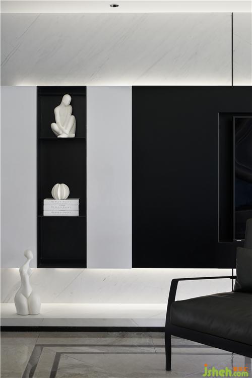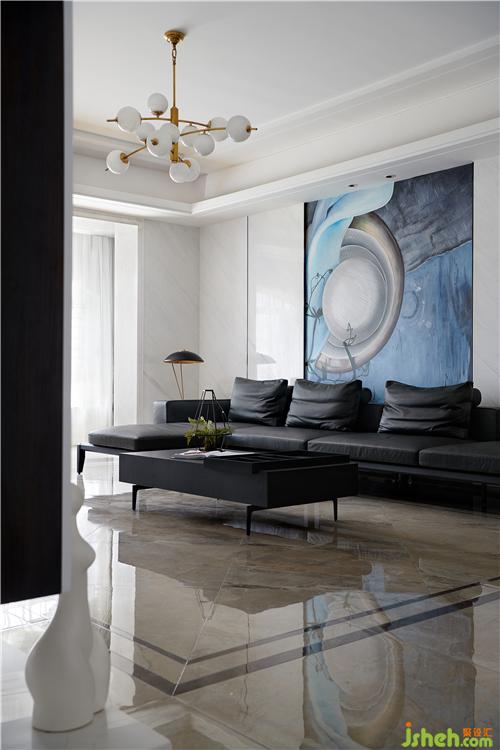 黑白灰的空間有著深邃的視覺延伸感,沙發(fā)背后精心挑選的手繪綴飾……色調(diào)柔和的背景鋪陳開來,在簡潔的黑白灰空間里,顯得份外恣意灑脫……餐廳的白色雕塑背景,若暈染開的水波,星光連綿,點綴著星夜,光芒圍繞……又似少女的螺髻,立體生動。光影纏繞間,交錯的線條刻畫著生活的豐富多變,同時中和了日常柴木油鹽的寡淡。不同的材質(zhì)在空間中相遇,奏著和而不同的生活樂章。