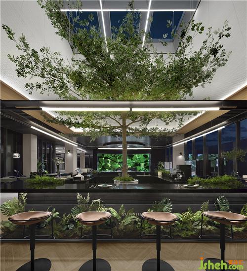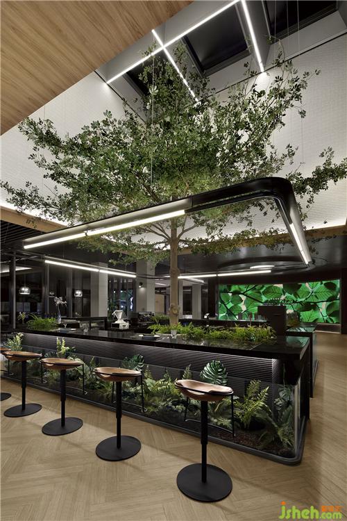 空間原本即有天井,設(shè)計(jì)巧妙利用了空間的這一基礎(chǔ)條件,將天光與自然之境引入室內(nèi)。圍合的吧臺(tái),創(chuàng)造一處視覺焦點(diǎn),成為一處人群休閑聚集的場(chǎng)所。