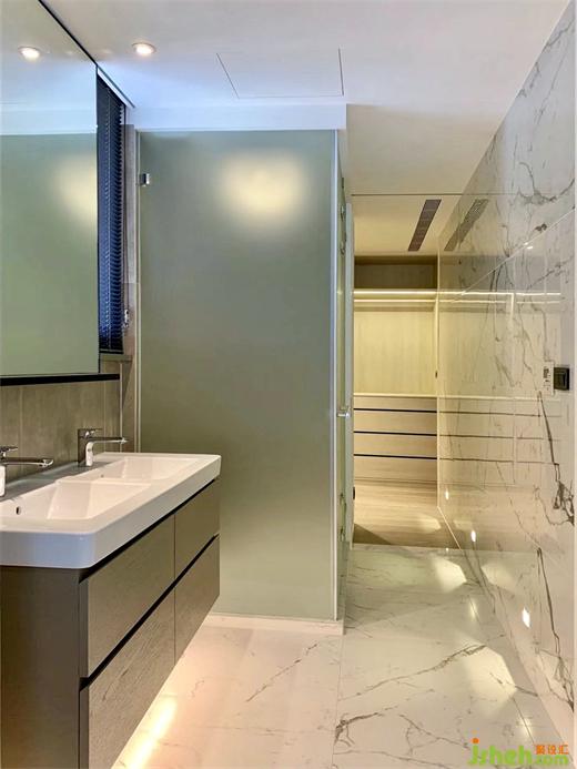 在公共空間上,我們賦予空間的氣質(zhì)是簡(jiǎn)約自然,豪宅設(shè)計(jì)運(yùn)用大面積的灰白色系為主調(diào),溫和的木色為空間底妝,結(jié)合木皮的自然紋理讓四周兼顧美觀舒適的同時(shí),植入安靜純粹的精神觀感,刻意隱藏的公共浴室讓墻面的材質(zhì)延伸至廚房,完成空間的統(tǒng)一性及延續(xù)性。
