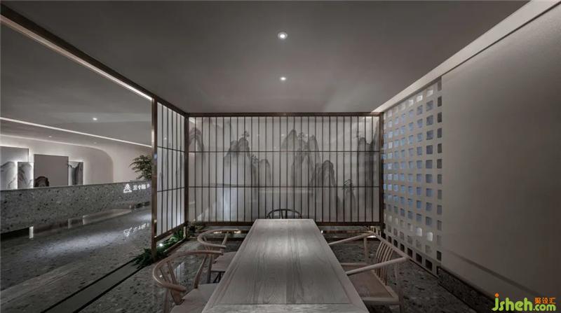 餐廳與茶室隔斷區(qū)域的鏤空空心磚陣列開(kāi)來(lái),通過(guò)每個(gè)孔洞的穿透將茶室區(qū)域的水墨山水栩栩如生的寫(xiě)照在餐廳的每個(gè)空間縫隙中,即強(qiáng)調(diào)了細(xì)節(jié)的品質(zhì),也體現(xiàn)了Three Yard的文化特征,帶給人大氣磅礴的觀感又不失思緒的延展福州養(yǎng)生館設(shè)計(jì)。